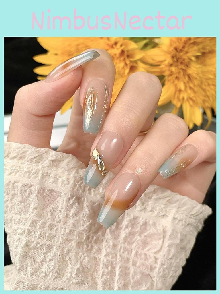 Forest Mist Color Handmade Nail Stickers With Ice Transparent Design Long Style Removable