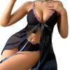 Mesh Floral Strap Bow Slit Nightgown Set With Lingerie Style Underwear