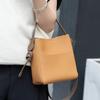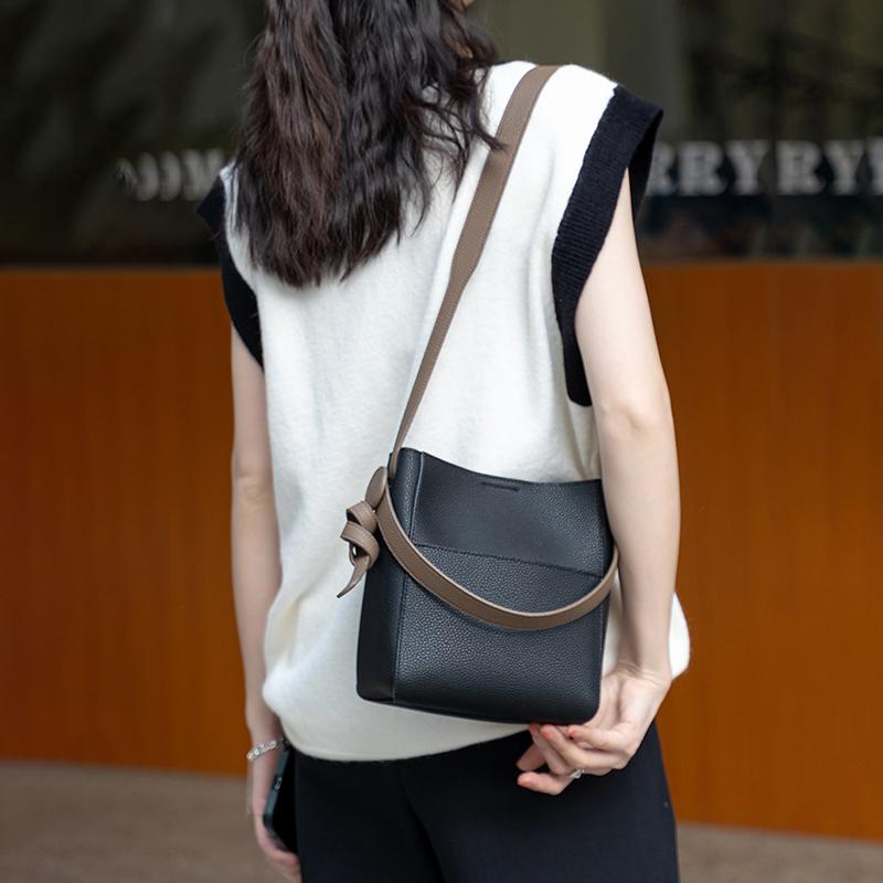 Original Cowhide Leather Woman Tote Bag Wide Strap Solid Color Commuter Crossbody Bag Large Capacity Bucket Luxury Brand Bag