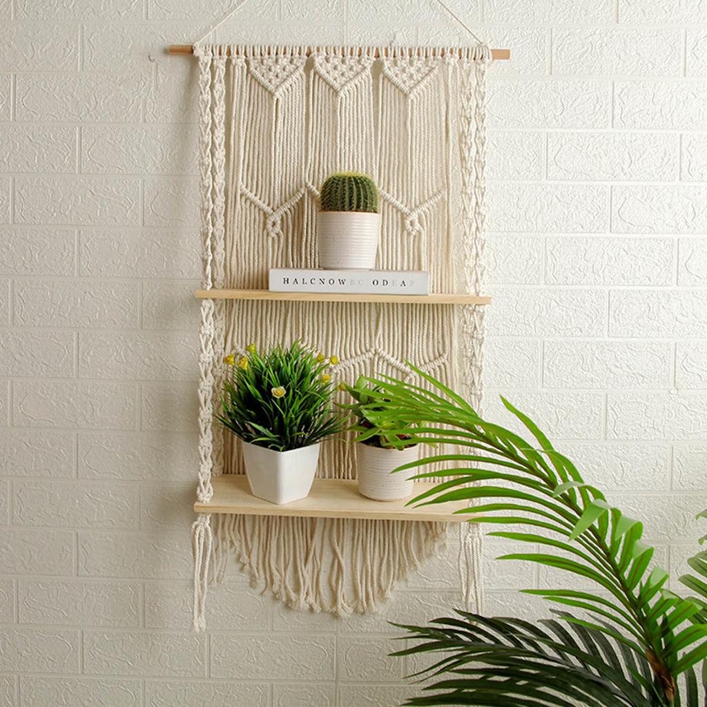 Bohemian Style Hand-Woven Wall Hanging Tapestry Wood Shelf Planter Basket 2 Tier Hanging Rack Art Wall Shelves Macrame