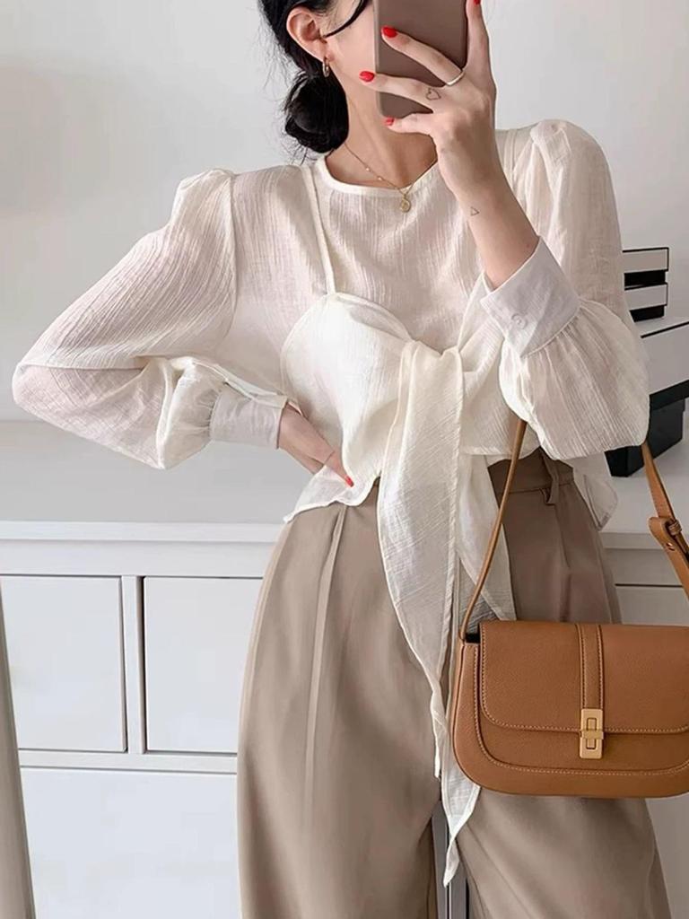 Ribbon Tie Bustier Blouse Set 5COLOR