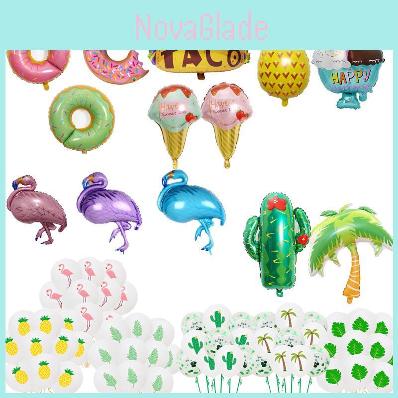 Size: Blue:105x51cm/41.34*20.08in, Purple And Pink:97x56cm/38.19*22.05in, Coconut Tree:90x80cm/35.43*31.5in, Cactus:63x73cm/24.8*28.74in, Donut:75x70cm/29.53*27.56in, Pineapple:48x80cm/18.9*31.5in, Pink Ice Cream, Green Ice Cream, 10 Flamingo Latex Balloons, 10 Pineapple Latex Balloons, 10 Turtle Leaf Latex Balloons, 10 Banana Leaf Latex Balloons, Mexican Cake, 15 Cactus Sequin Set, 15 Coconut Tree Sequin Ball Set, Straw Ice Cream Balloon
