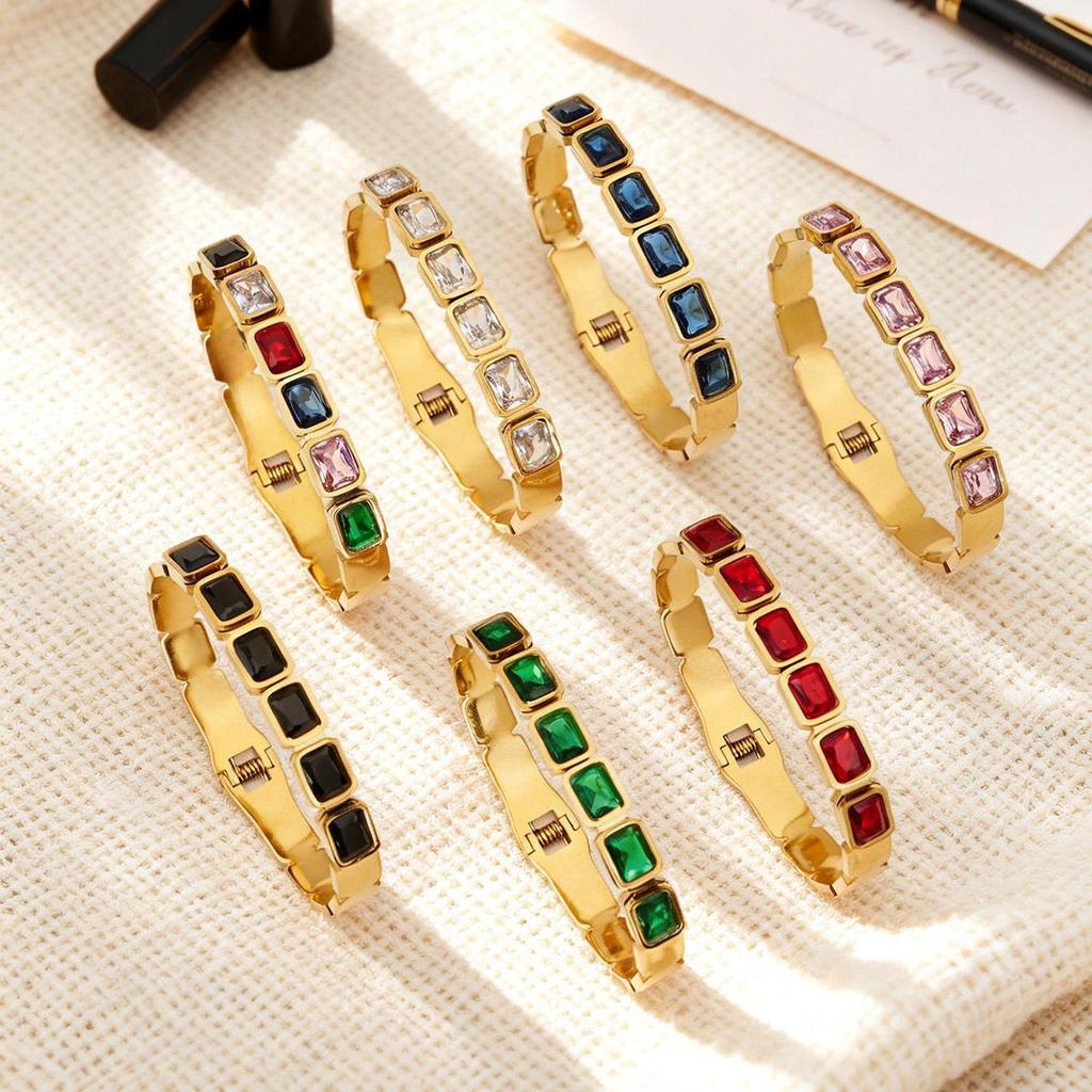 18K Gold Plated Stainless Steel Bracelet with Square Colored Glass Stones In Trendy European and American Niche Design - Fade Resistant.