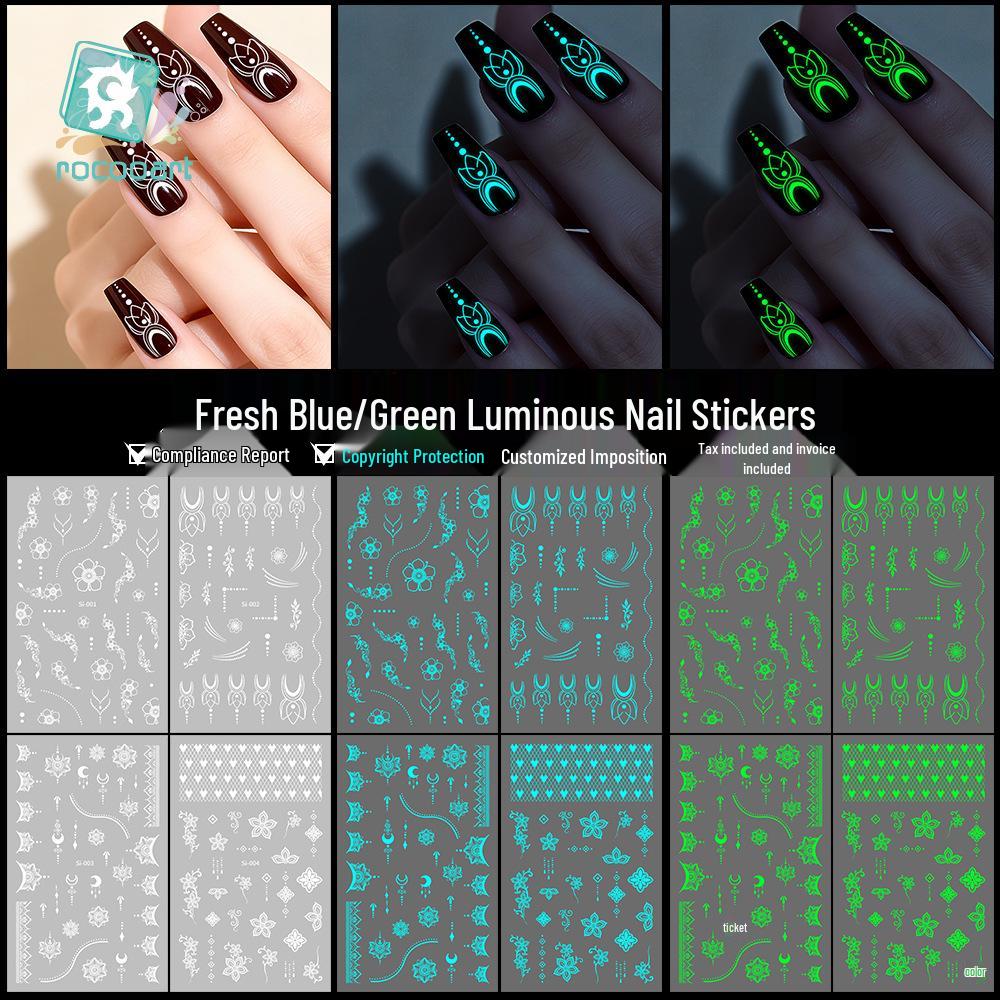Blue-Green Luminous New Year Nail Stickers with White Lace and Butterfly Designs
