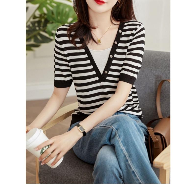 Women's Summer Black White Stripe Fake Two Piece V Neck Short Top