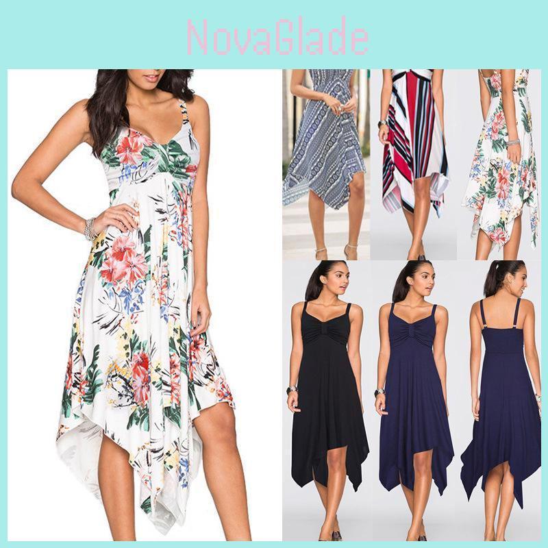 Fashion Summer Womens Sleeveless Vneck Dress With Irregular Printing And Strap Details