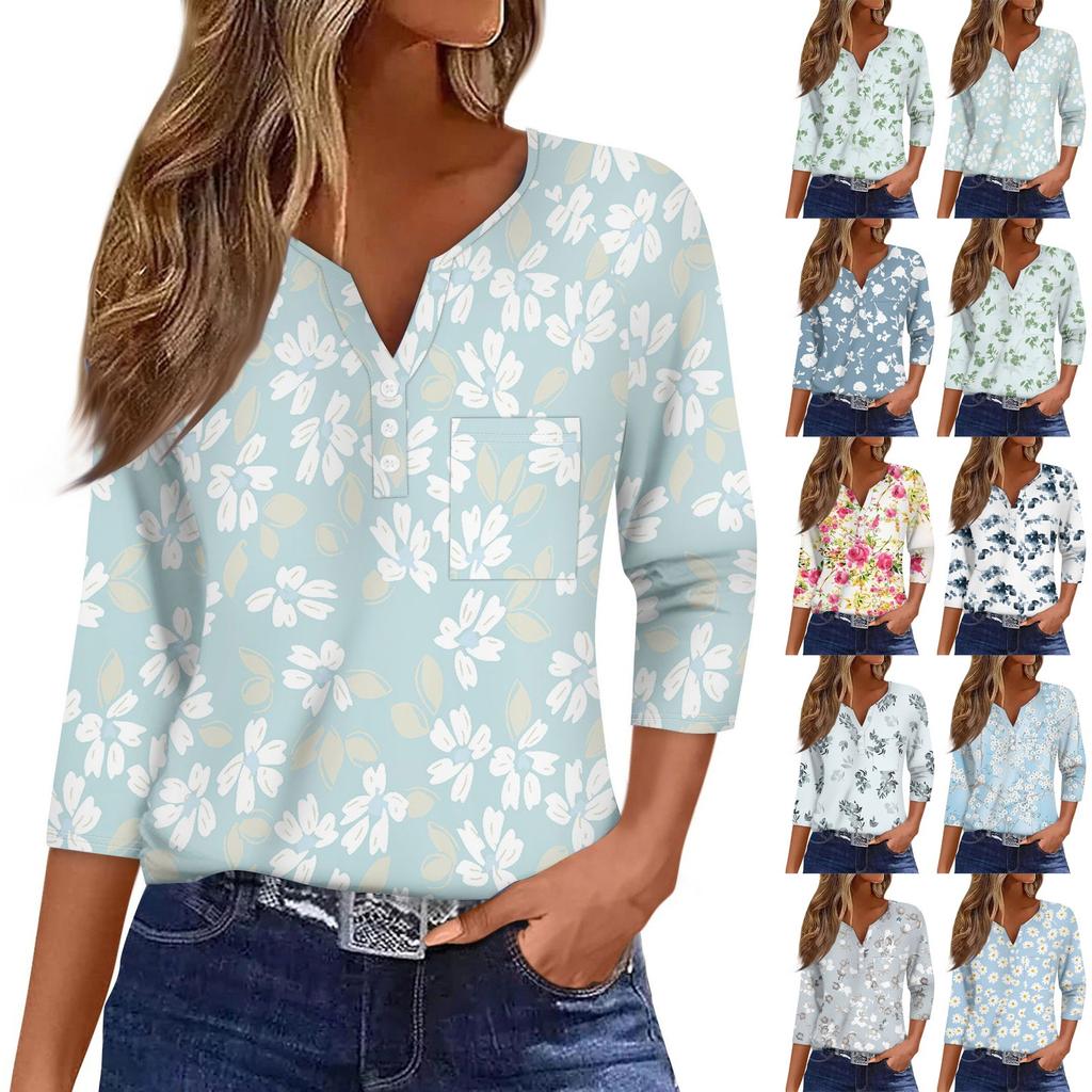 Women's Casual Fashion V-neck Loose Versatile Floral Print Three-quarter Sleeves