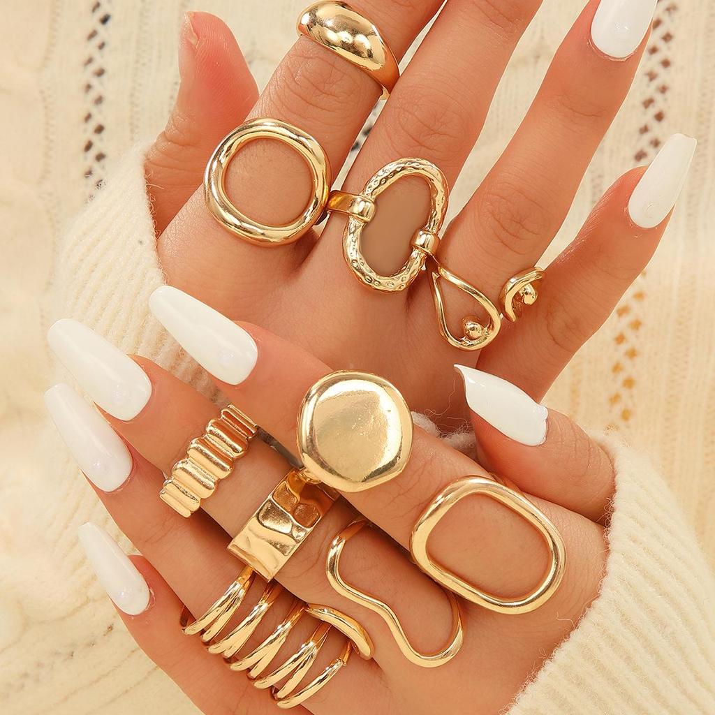 European & American Trendy Geometric Luxury 10-Piece Ring Set: Versatile and Elegant Hollow Design