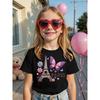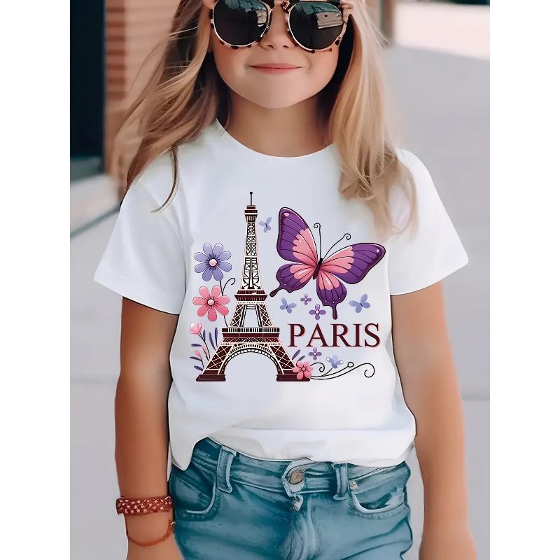 European Sizes Girls' Summer Clothing, T-Shirt with Eiffel Tower And Butterfly Flower Print, Creating a Stylish Look