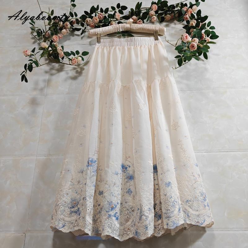 Spring Summer Women Maxi Long Skirt High Waist Delicate Floral Embroidery Classical Skirt Vintage Elegant Hollow Out Apricot A-Line Skirt