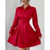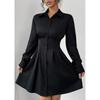 Women's Elegant Turn Down Collar Long Sleeve Knee-Length Button Down Shirt Dress Slim Waist Pleated Mini Dresses