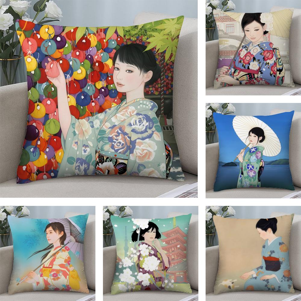 Kimono Girl Japanese Style Cushion Cover Plush Fabric Soft DoubleSided Printed Sofa Warm Winter Home Child Gift Pillow Case