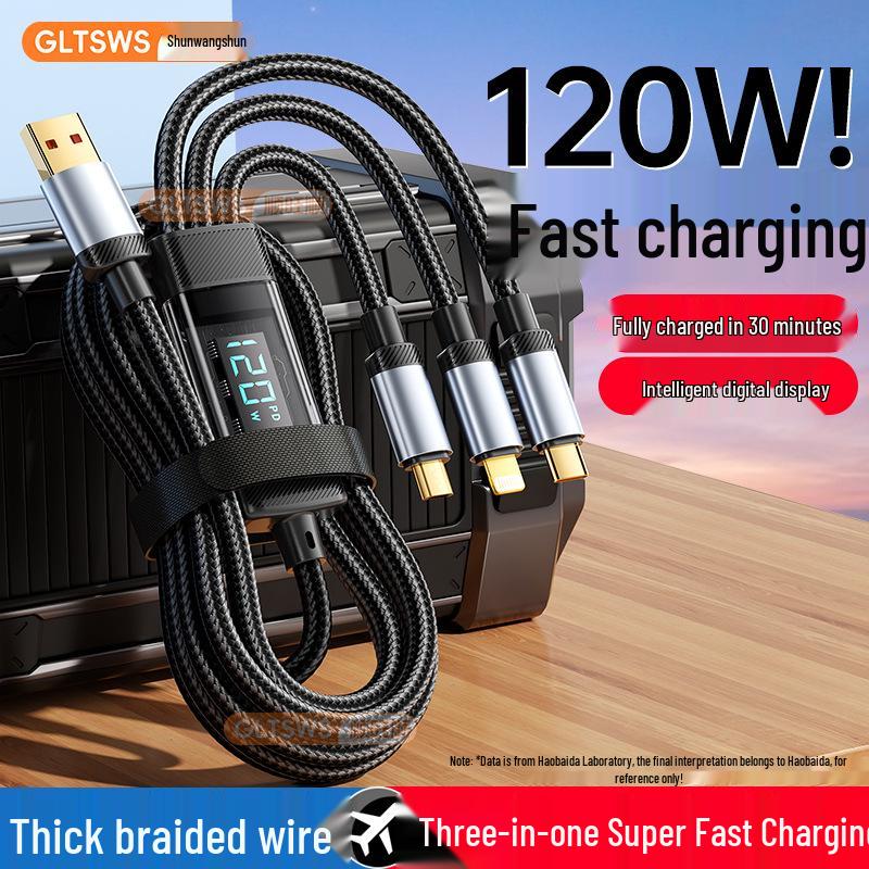 120W Smart Digital Display 3-in-1 Fast Charging Cable for Huawei, Apple 15, Xiaomi, and Android Devices