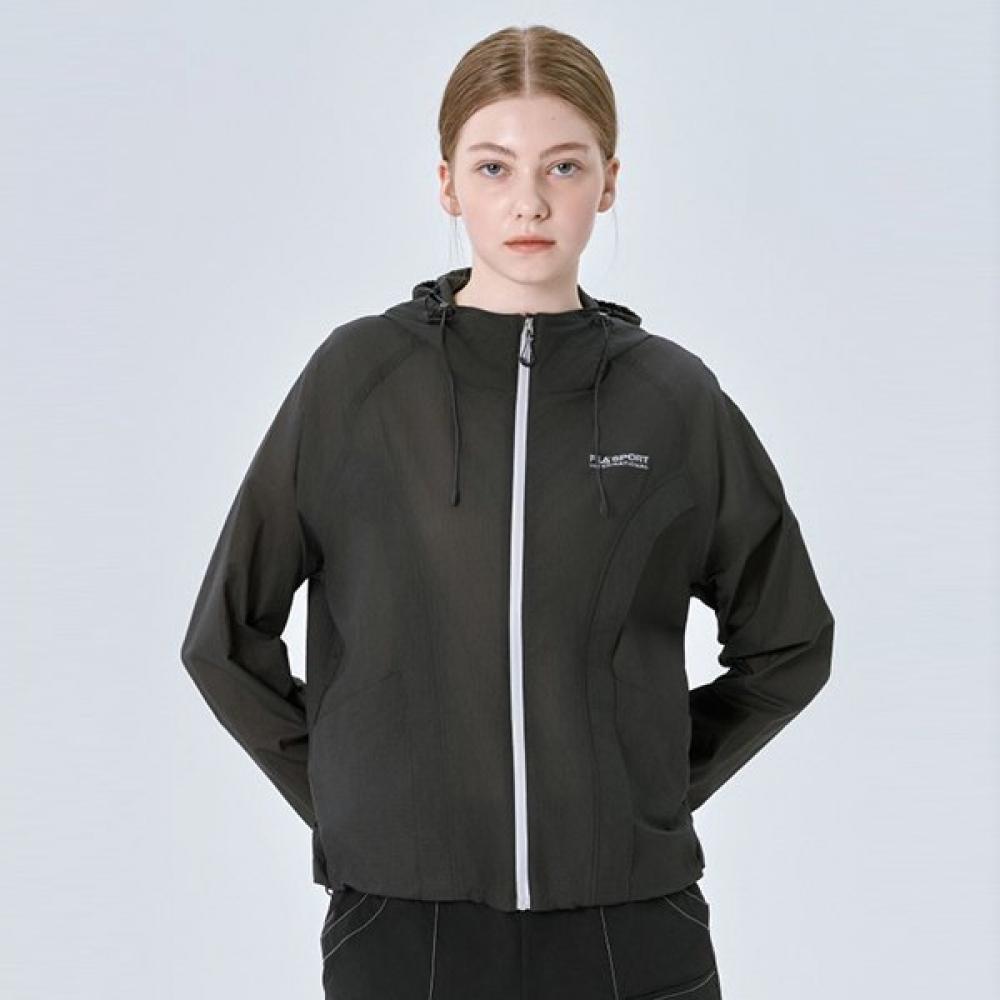The FILA Lightweight Ripstop Hooded Windbreaker is a women's hiking jacket made from lightweight ripstop material. Available in Charcoal color, it features a hood design. The outer fabric is made from 100% nylon, and the lining is made from 100% polyester, providing excellent durability and comfort.