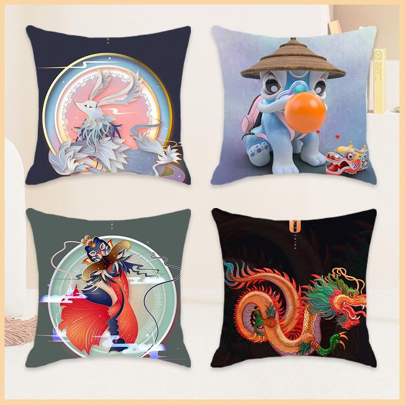 New Chinese Style Mythical Beast Lion Pillowcase - Festive Cartoon Home Decor Cushion for Sofa and Bed.