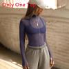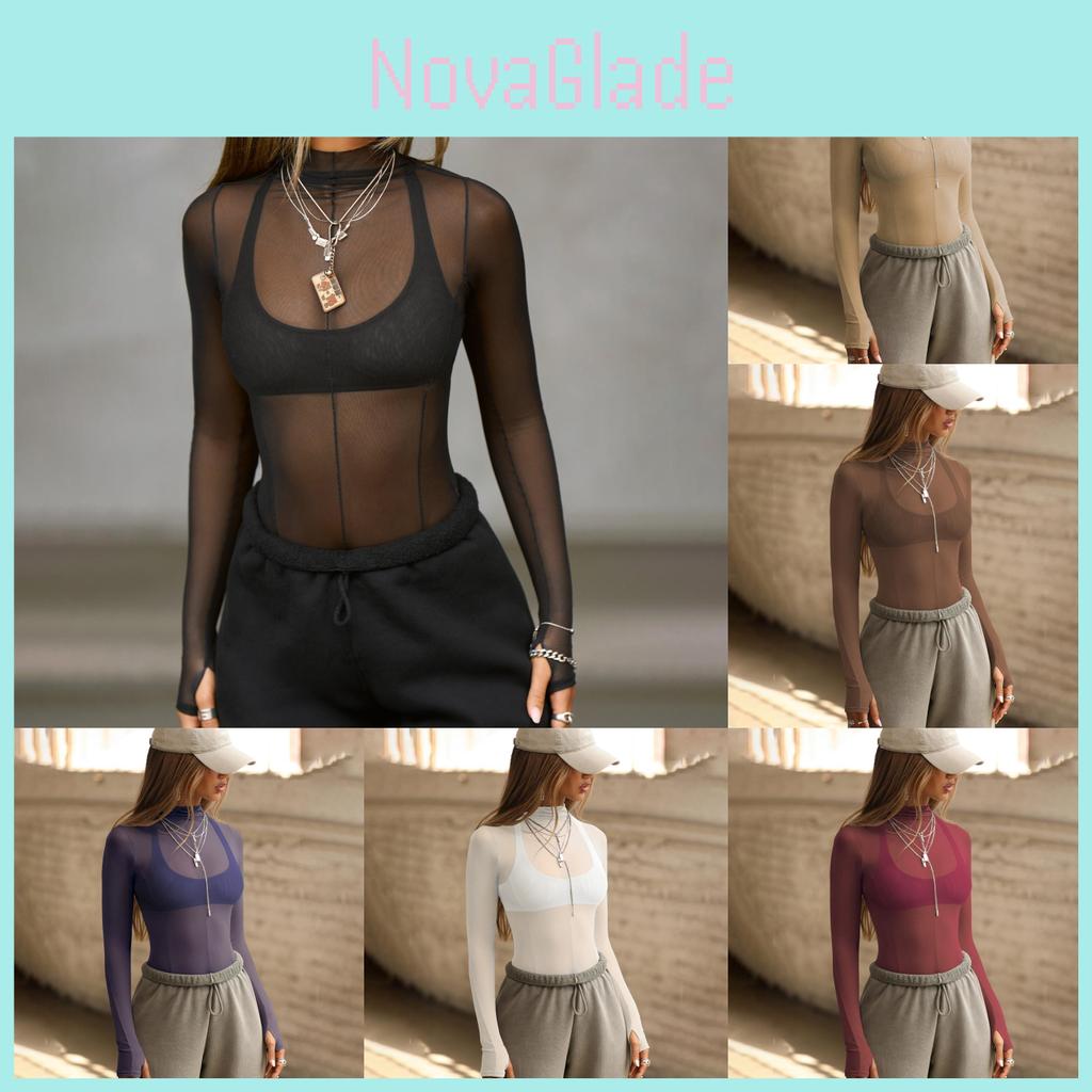 This slim-fit sheer long-sleeve blouse features a semi-high collar and a digitally printed mesh design made from 90% nylon and 8% spandex, measuring approximately in length. Its lightweight, soft fabric offers comfortable wear for various occasions, including parties, dance, yoga, or daily outings. Wipe clean with a damp cloth to maintain its appearance.