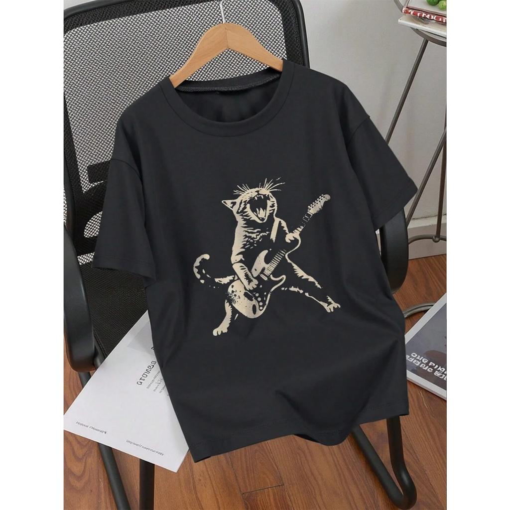 Rock Cat Playing Guitar Print T-shirt Casual and Versatile Style Suitable for Daily Wear and Going Out In Summer