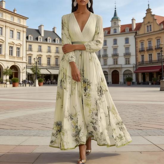 This elegant women's dress is perfect for parties, beach weddings, garden events, and holiday dinners, combining style and comfort effortlessly. Featuring a bold floral pattern with a deep V-neck, long sleeves, and a wrap top that cinches at the waist, it offers a flattering silhouette.
