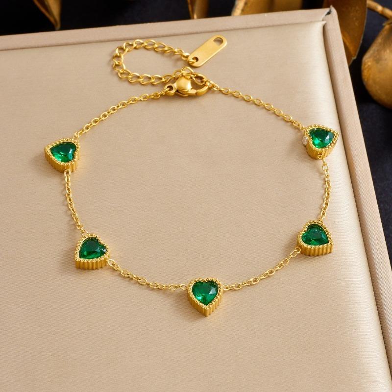 Gold Anklet with 5 Green Heart Gems, Dainty Foot Chain for Women Summer Beach Jewelry Gift