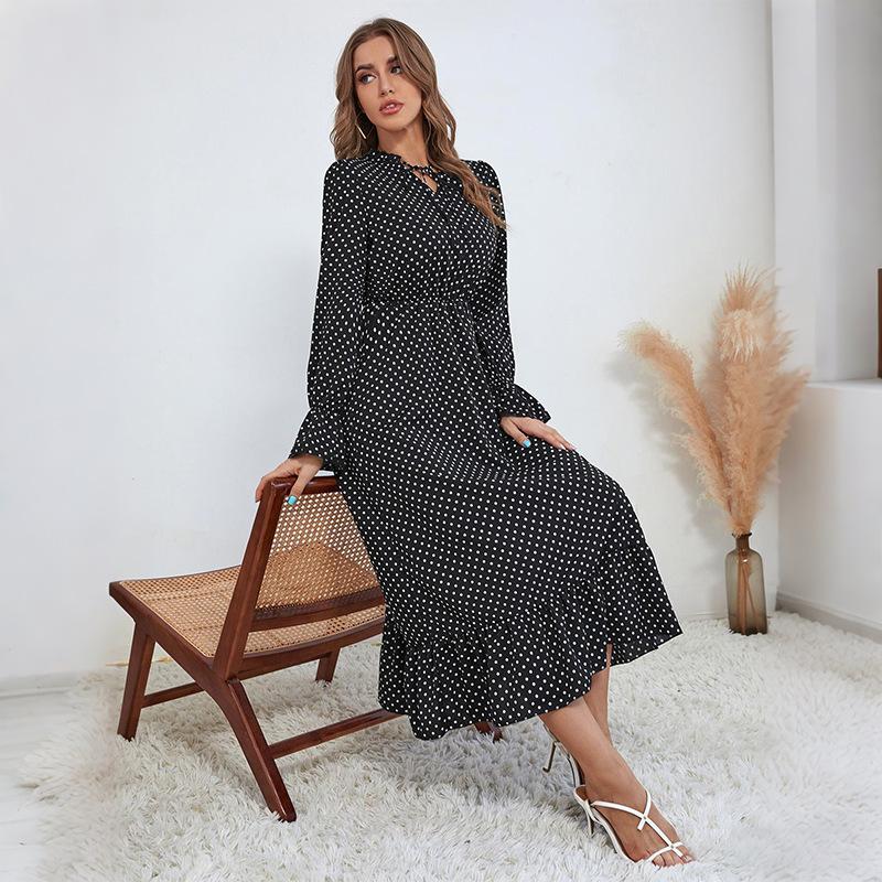 Women's Fashion Spring Fall Polka Dot Print Long Sleeve V-Neck High Waist Casual Dresses