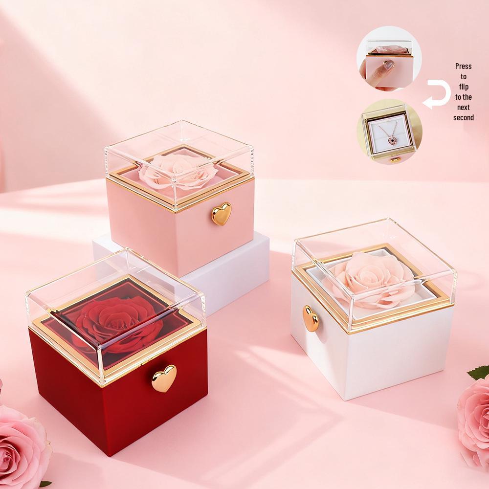 Automatic Rotating Acrylic Jewelry Box with Preserved Rose and Necklace - Valentine's Day Gift