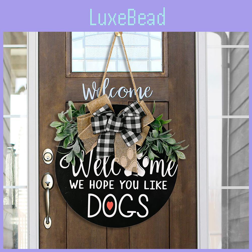 Charming Rustic Wooden Dog Sign With Delightful Bow And Leafy Wreath For Home Decor