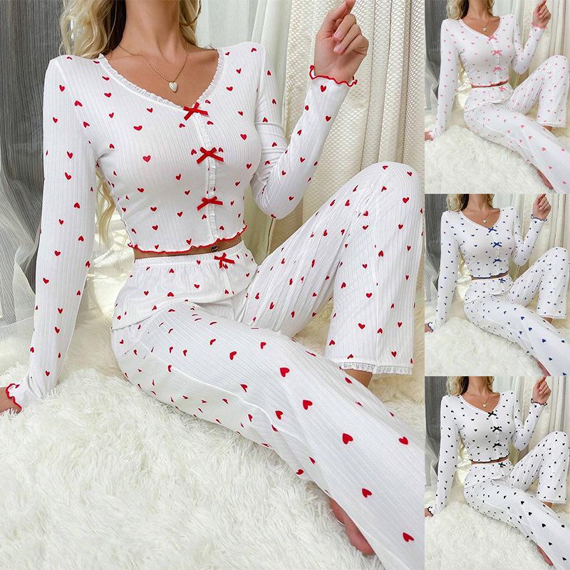 Indulge in cozy elegance with this women's pajama set, featuring a charming heart print design. Crafted from luxurious jacquard rib material, this set offers both comfort and style. The long sleeve top with a flattering V-neck pairs perfectly with matching pants, making it ideal for lounging or a restful night's sleep. Enjoy the blend of fashion and comfort in this delightful pajama set.