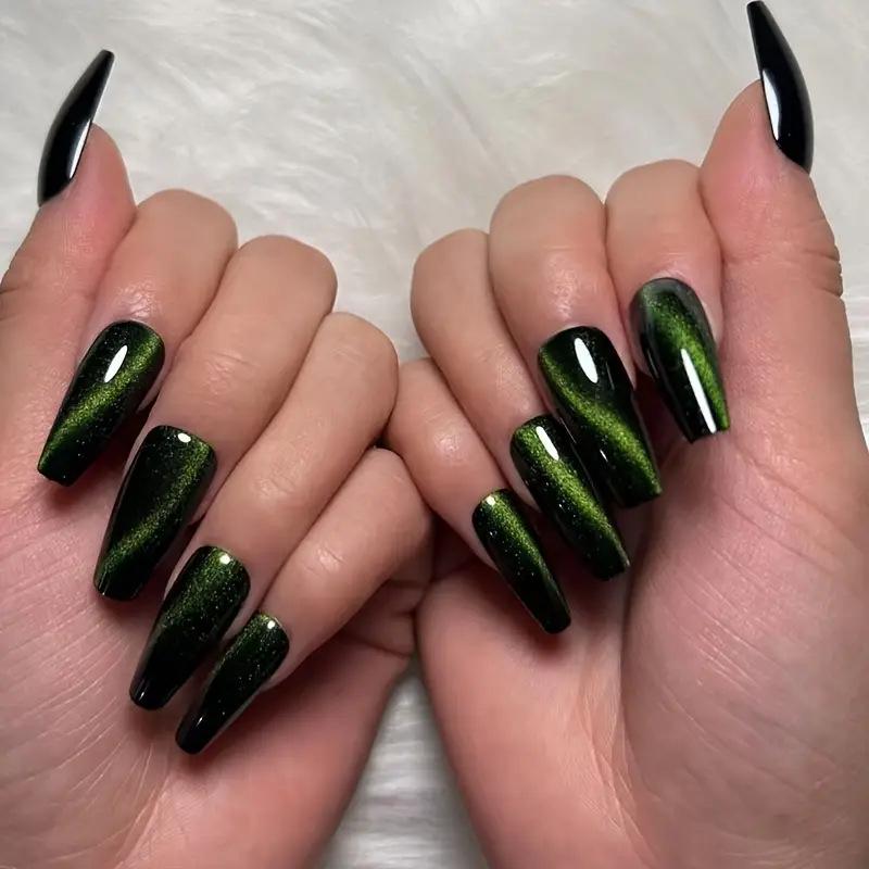 24pcs Gradient Cat Eye Trapezoid Nails: Autumn/Winter Black & Green Nail Art Stickers