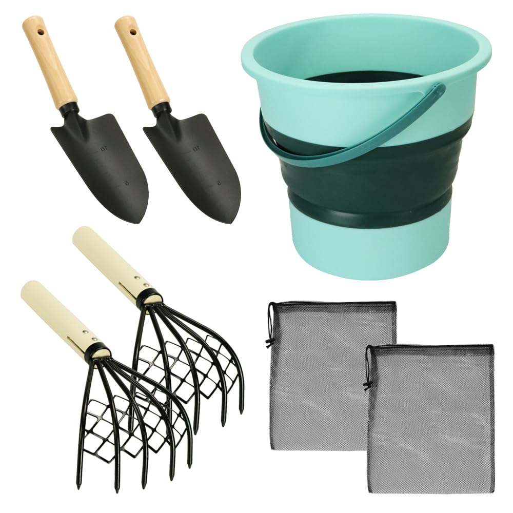 SoraVie Clam Digging Tool Set: Shovel/Rake/Bucket/Storage Bag - Easy To Dig, Compact, 2-4 Person (Green)