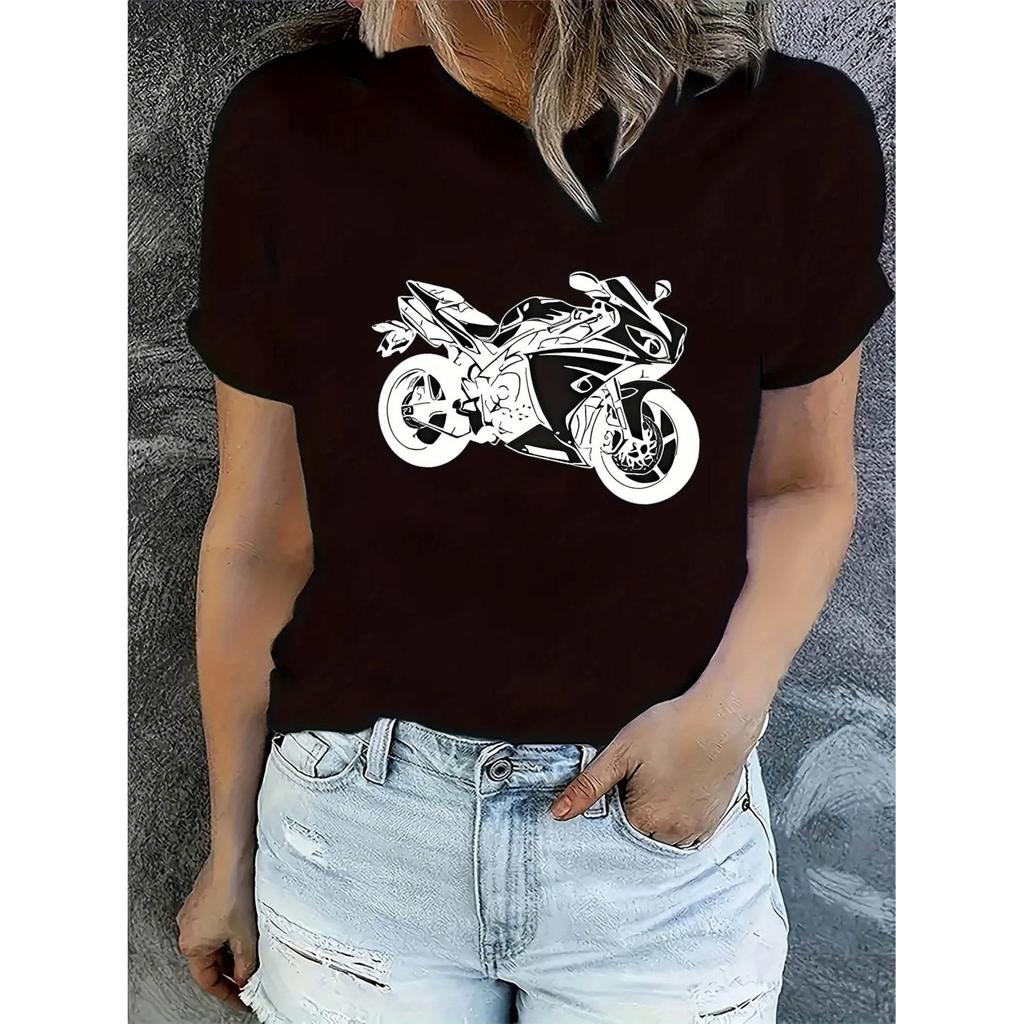 Motocycle Fashion T-shirt Women's Casual Crew Neck T-shirt with Geometric Motorcycle Print Concise Style T-shirt
