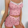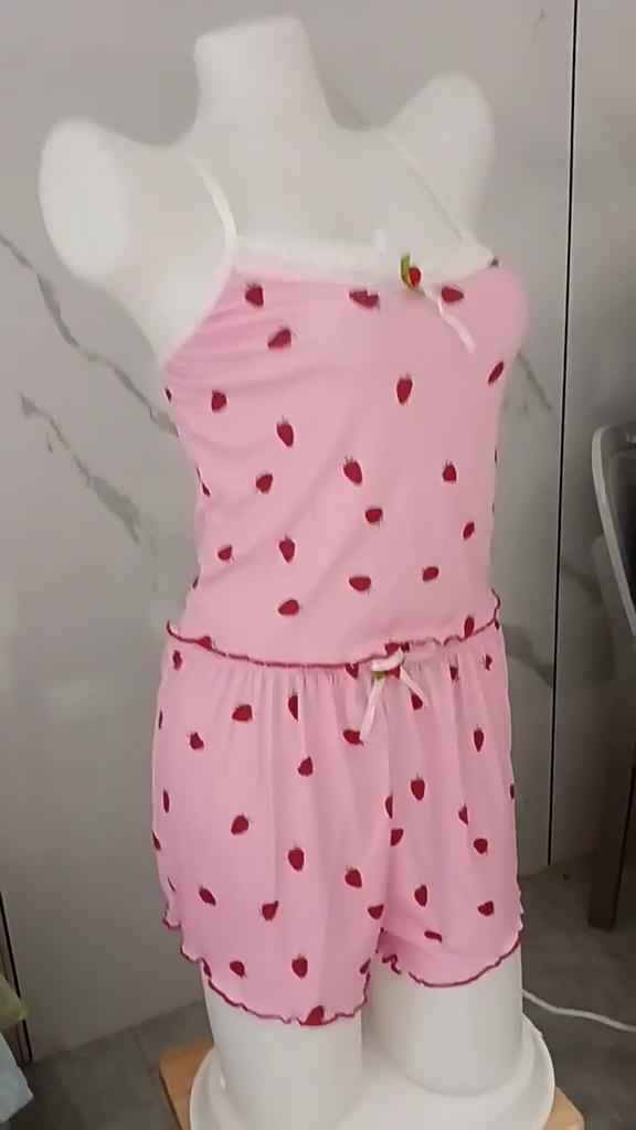 Women Pajama Set Lace Trim Camisole & Shorts – Sexy Strawberry Print Two-Piece Sleepwear Lounge Wear