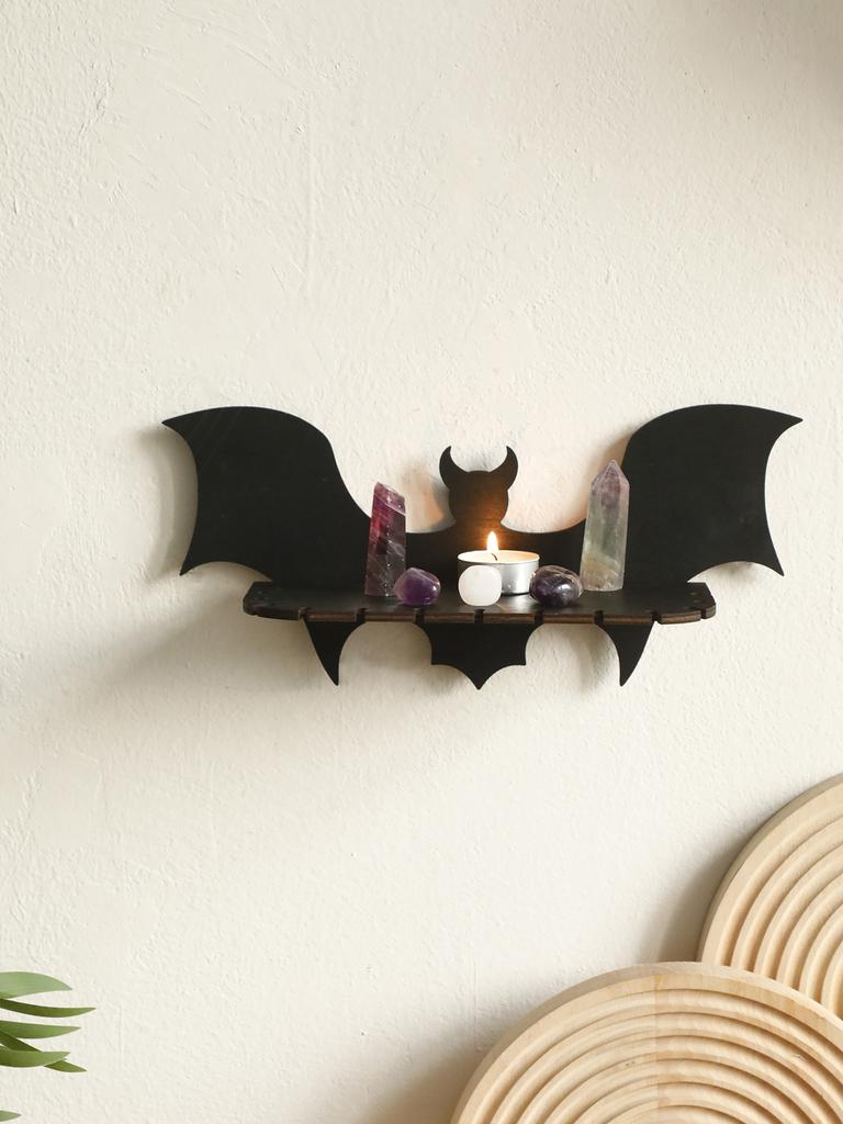 Wooden Shelf Gothic Bat Wall Hanging Decor Black Floating Shelves Display Stand Crystal Holder Witch Home Decor Halloween Decor