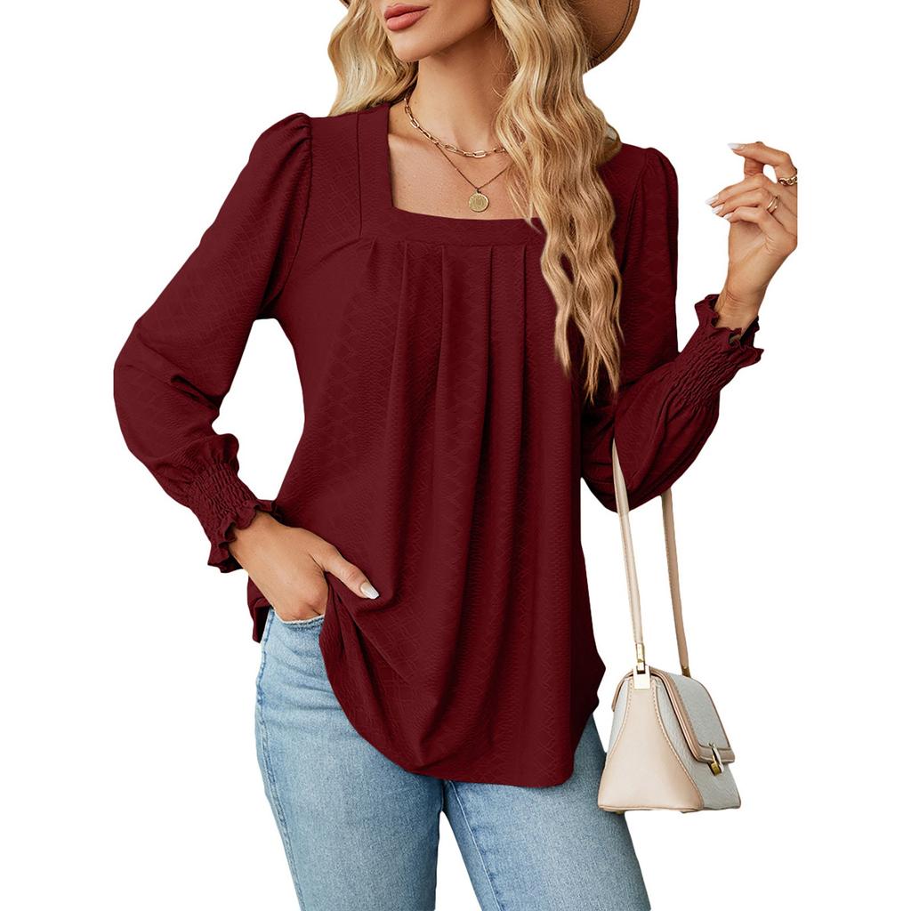 Women's Fashion Square Neck Color Pleated Long Sleeve Tuxedo Shirt Top