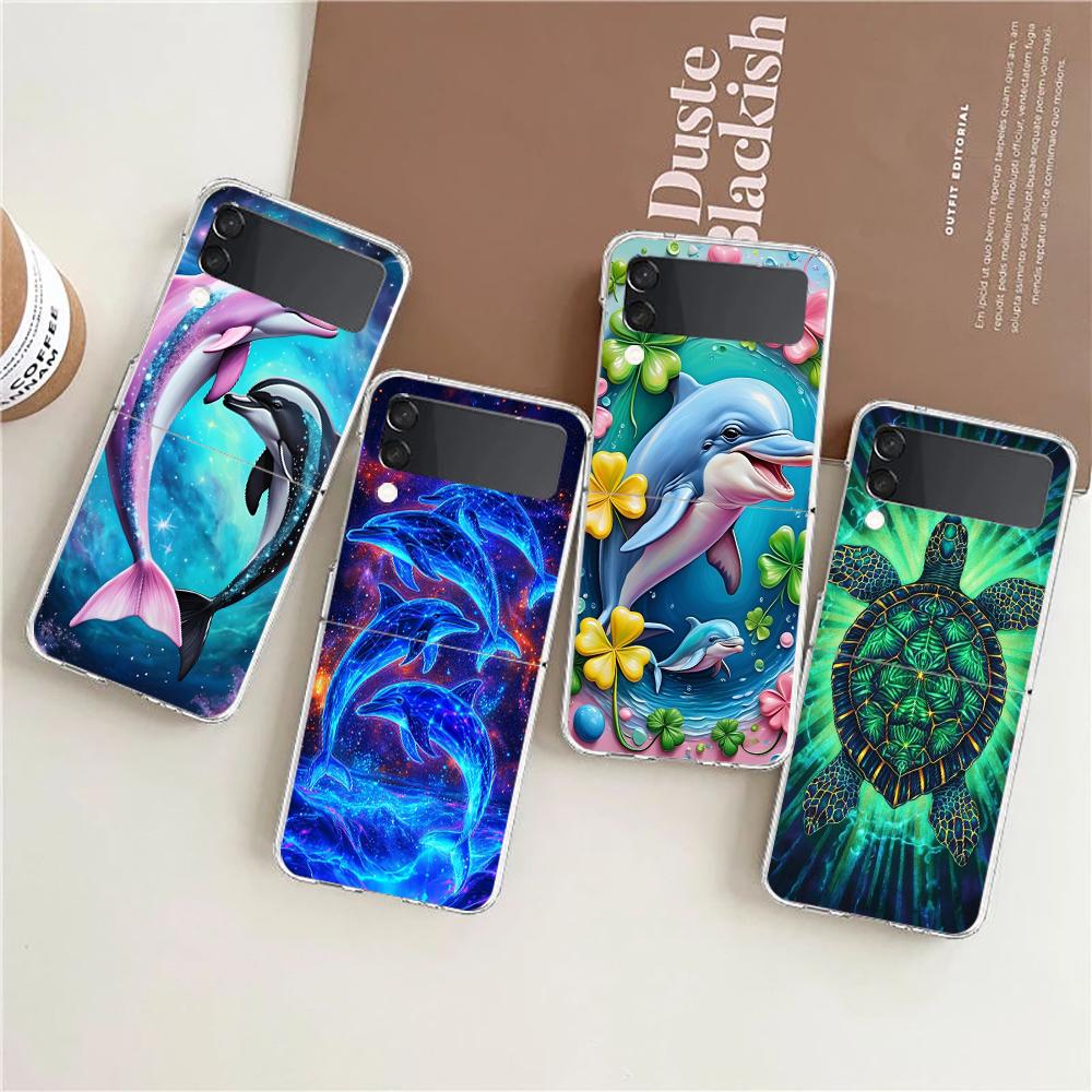 Phone Cover For Samsung Galaxy Z Flip 7 6 5 4 Case Transparent For Samsung Z Flip 3 Hard PC Shell Ocean Cute Dolphin Sea Turtle