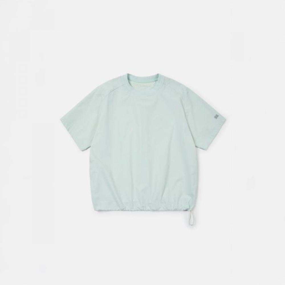 This is a woven short-sleeve T-shirt that can be worn coolly and comfortably, featuring UV protection (UPF 50+) and water-repellent functions. Optimized for summer outdoor activities, it has water-repellent and UV protection features that make it suitable for various outdoor activities. The UV protection feature protects the skin from the hot sun during summer. Additionally, it has a string adjustment and reflective logo detail that allows silhouette adjustment and wind-blocking effect through the bottom string. It is part of the daypack series and can be worn alone or as a set.