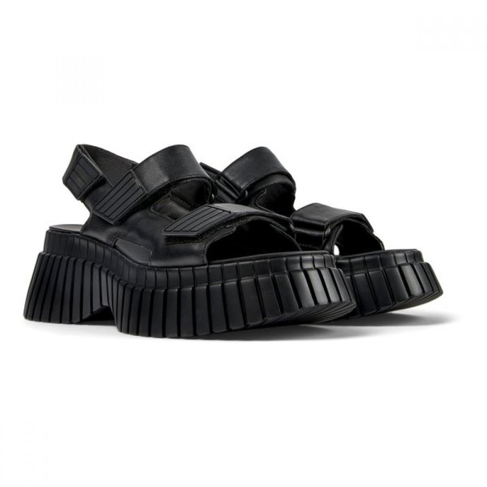 Camper's women's sandals 'BCN K201511-005' are luxurious black sandals made from calf leather. Constructed with lightweight EVA outsoles and an inseparable EVA strap, they offer comfort and feature a bold flat design, making them perfect for various summer styles. These sandals fulfill both style and comfort needs, fitting seamlessly into casual looks.