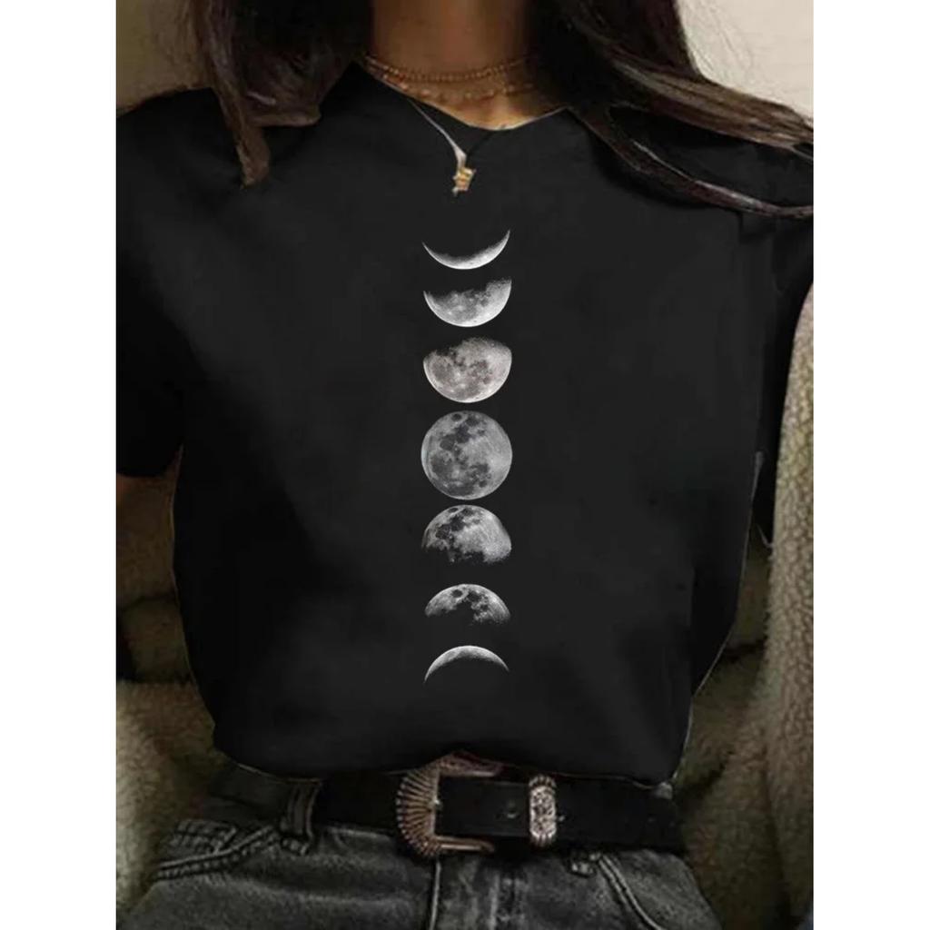 Maycaur New Funny Moon Print T Shirt Women White and Black Shirts Fashion Round Neck Short Sleeve T-Shirt Summer Tees Casual Top