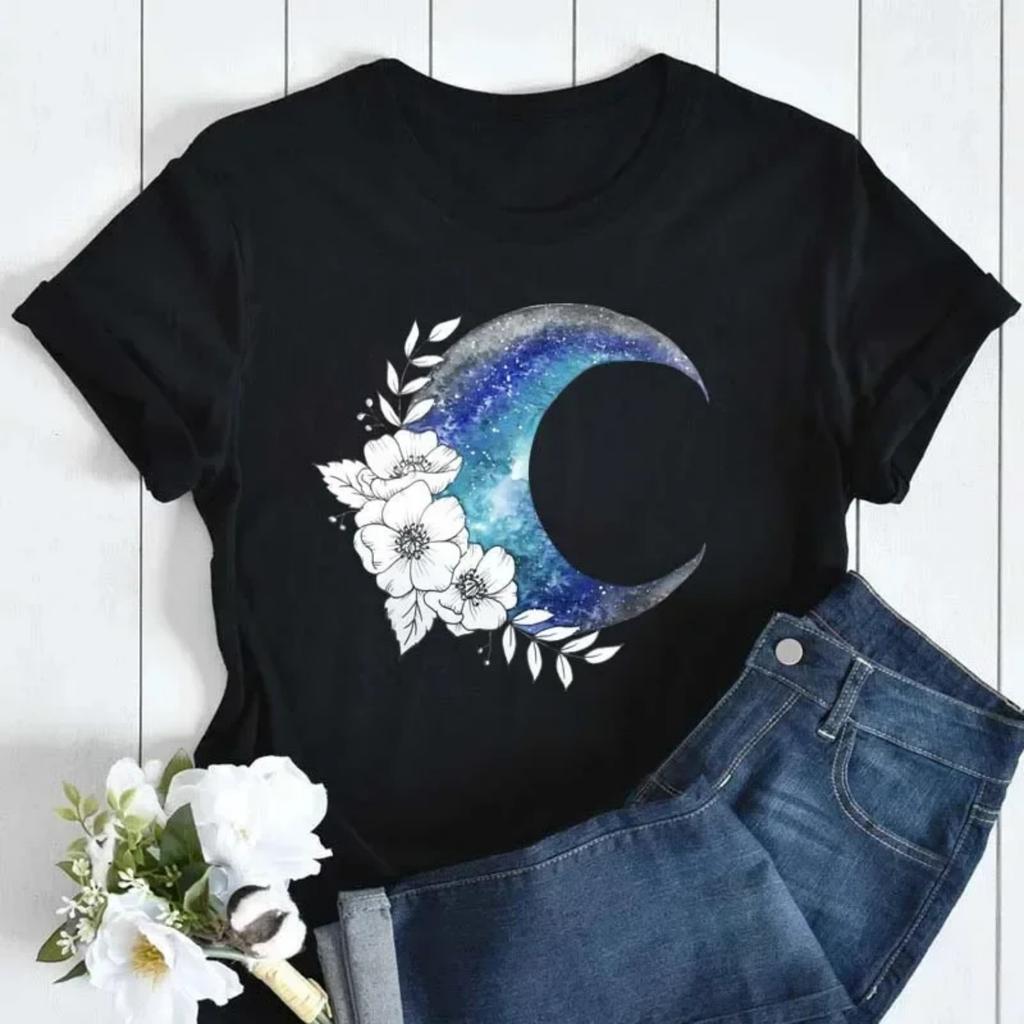 Plus Size Maycaur Fashion Vintage Moon with Floral Print Women T Shirt Casual Short Sleeves Female Tshirts Cartoon Graphic Tee