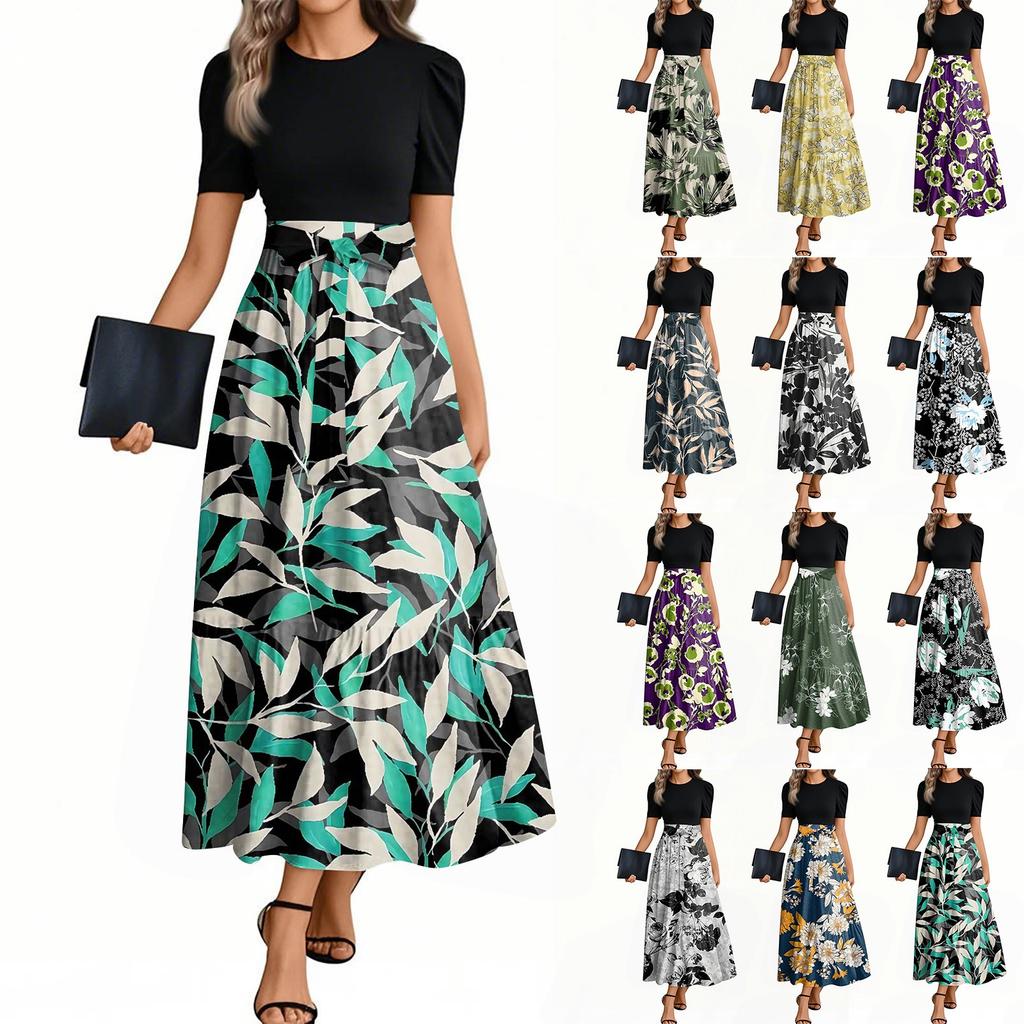 Women's Fashion Casual Belted Round Neck Short Sleeve Floral Patchwork Elegant Dresses