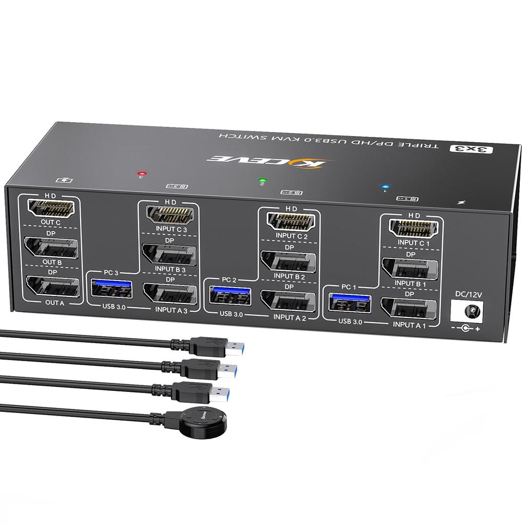 【Triple Monitor KVM Switch】This KVM switch with two DisplayPort 1.4 + HDMI 2.1 and USB 3.0 ports allows you to share three monitors and four USB 3.0 ports (keyboard, mouse, and other USB devices) across three desktops/laptops. It helps organize and streamline your workspace, making it an ideal choice for working from home. ▲▲▲Note: You can only share three monitors across three PCs using this KVM if your computer supports three displays or multi-display setups.