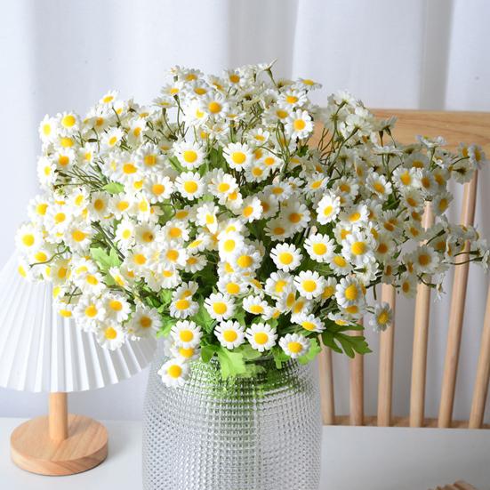 Abundant Blooms on Each Stem: Each stem boasts up to 30 dense florets featuring classic white petals surrounding vibrant yellow pistils in a charming chamomile shape. This fullness creates a rich visual impact when displayed in vases or arrangements. The clusters bring a soothing pastoral feel reminiscent of Nordic-style interiors, making it ideal for adding warmth and natural beauty to living rooms, dining tables, or photo backdrops.