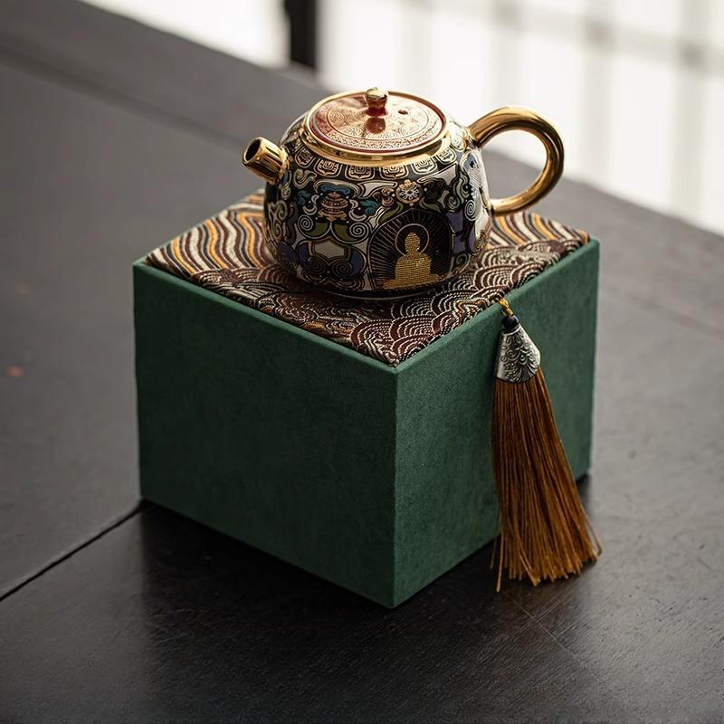 Dunhuang Gold & Silver Inlay Black Thangka Glaze Taotie Teapot for Gongfu Tea Ceremony Home Gift