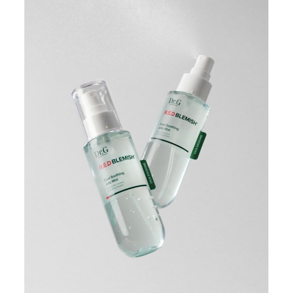 DR.G Red Blemish Cool Smoothing Jelly Mist 100mL X 2 is a jelly serum mist that cools redness on the skin by -7 degrees, providing soothing relief. This product gently calms sensitive skin, and its solid gel formula forms a moisture barrier upon contact with the skin, offering long-lasting hydration and cooling sensations. It lowers the internal heat of the skin and perfectly adheres to makeup, preventing it from flaking.