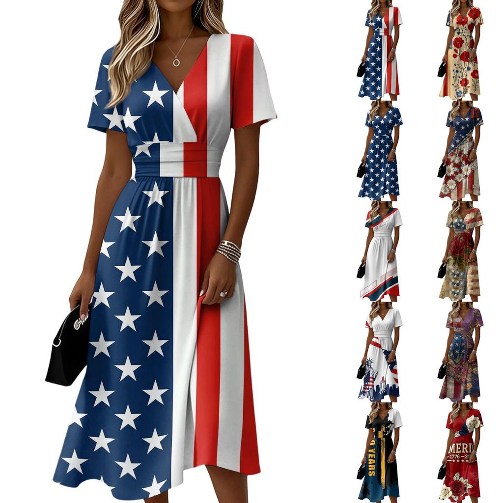 Women's Independence Day Print Casual Fashion Short Sleeve V-Neck Dress