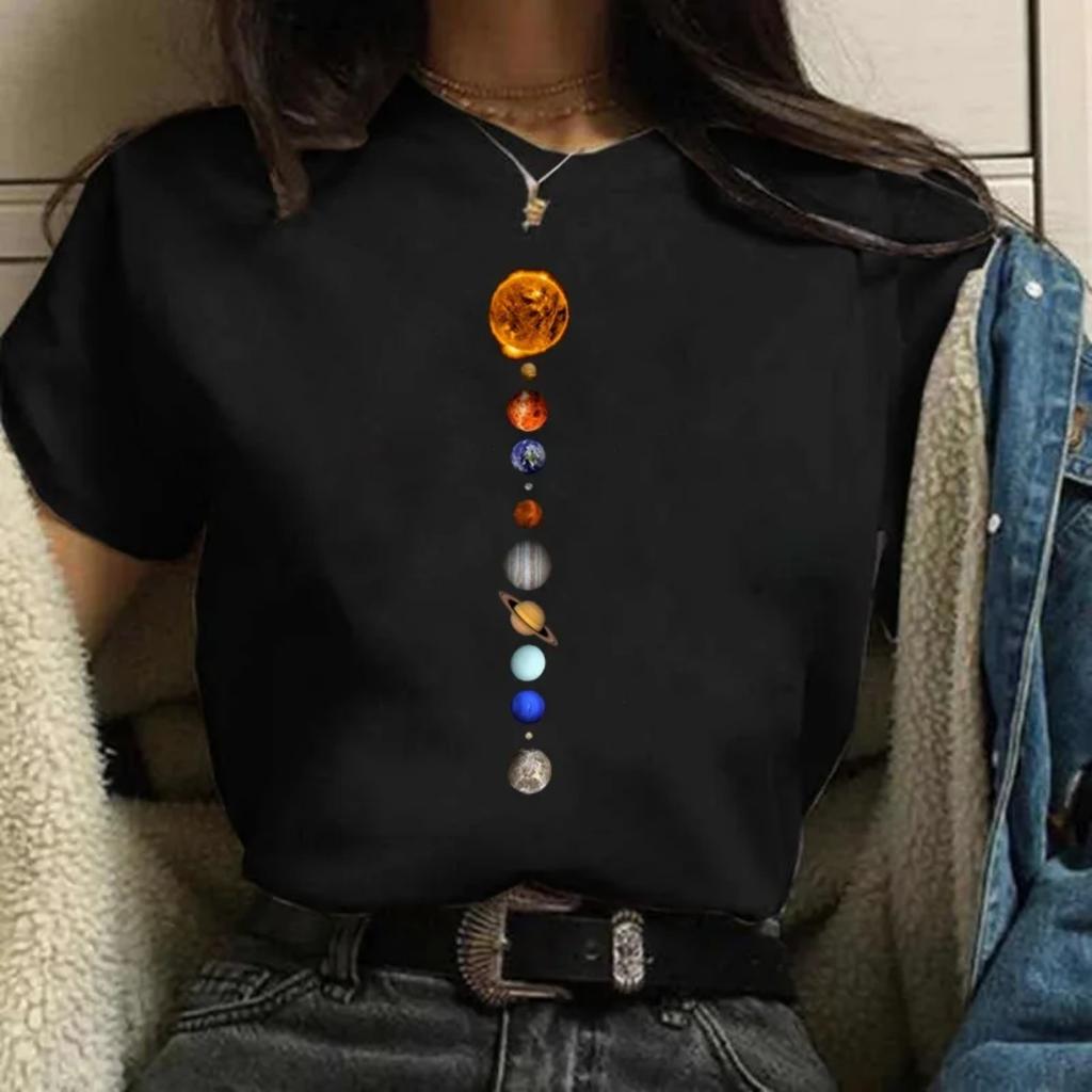 Universe Planets Print Tshirt Women Aesthetic Kawaii Graphic T Shirt Female Tee Tops Retro Black Tshirt Ladies Clothing