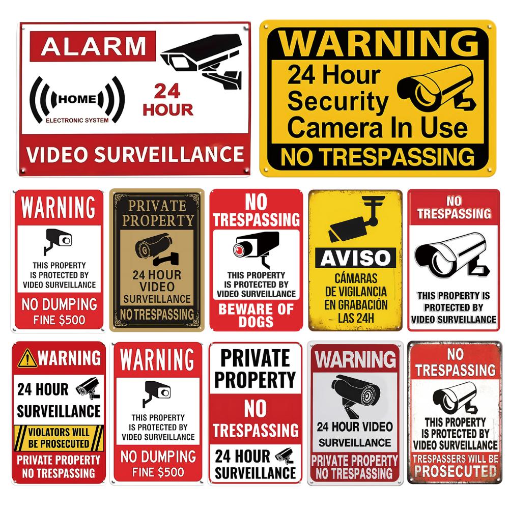 Vintage Tin Sign Retro Warning Metal Sign Video Surveillance Signs No Trespassing Sign Poster For Garage Home Man Cave Wall Deco