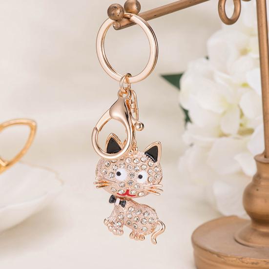 This exquisite cat-shaped keychain pendant features a durable alloy electroplated finish that ensures long-lasting color and resistance to fading. Adorned with firmly inlaid, colorful rhinestones in pink, gold, blue, and champagne hues, it sparkles brilliantly under light, framed by a luxurious golden alloy border for a high-end look.