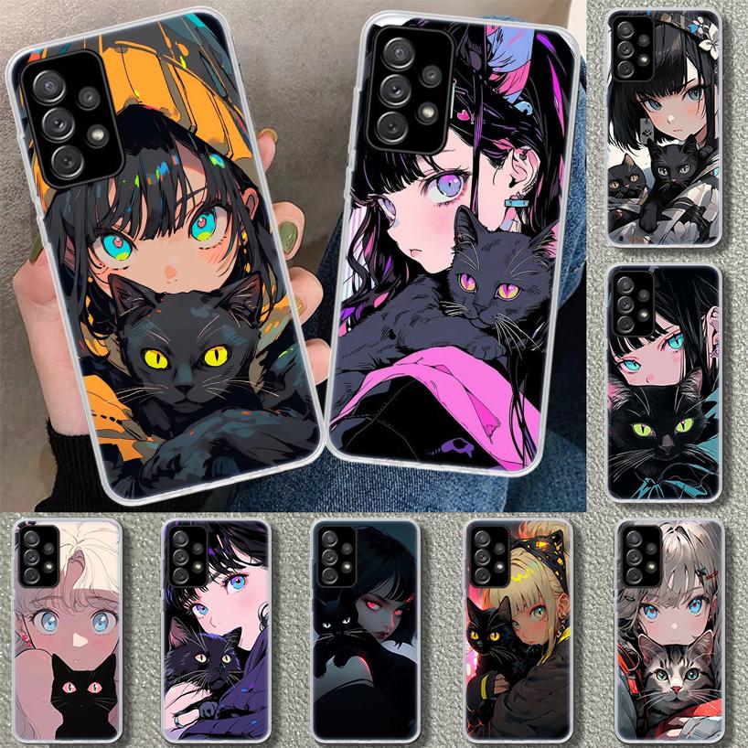 Anime Girls Cute Black Cat Phone Case Cover for Samsung Galaxy A12 A22 A32 A52 A72 A02S A51 A50S A31 A20S A10S Note 20 Ultra 10