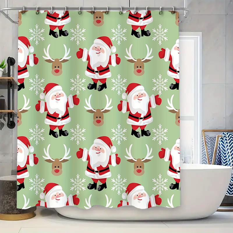 Santa Claus Reindeer Christmas Shower Curtain Set for Bathroom Decor Green Snowflake Pattern Bath Mat Tissue Holder 24 Hooks Non