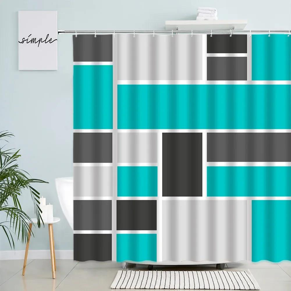 Creative Geometric Shower Curtains Black Grey Turquoise Square Plaid Bath Curtain Set Polyester Fabric Bathroom Decor with Hooks